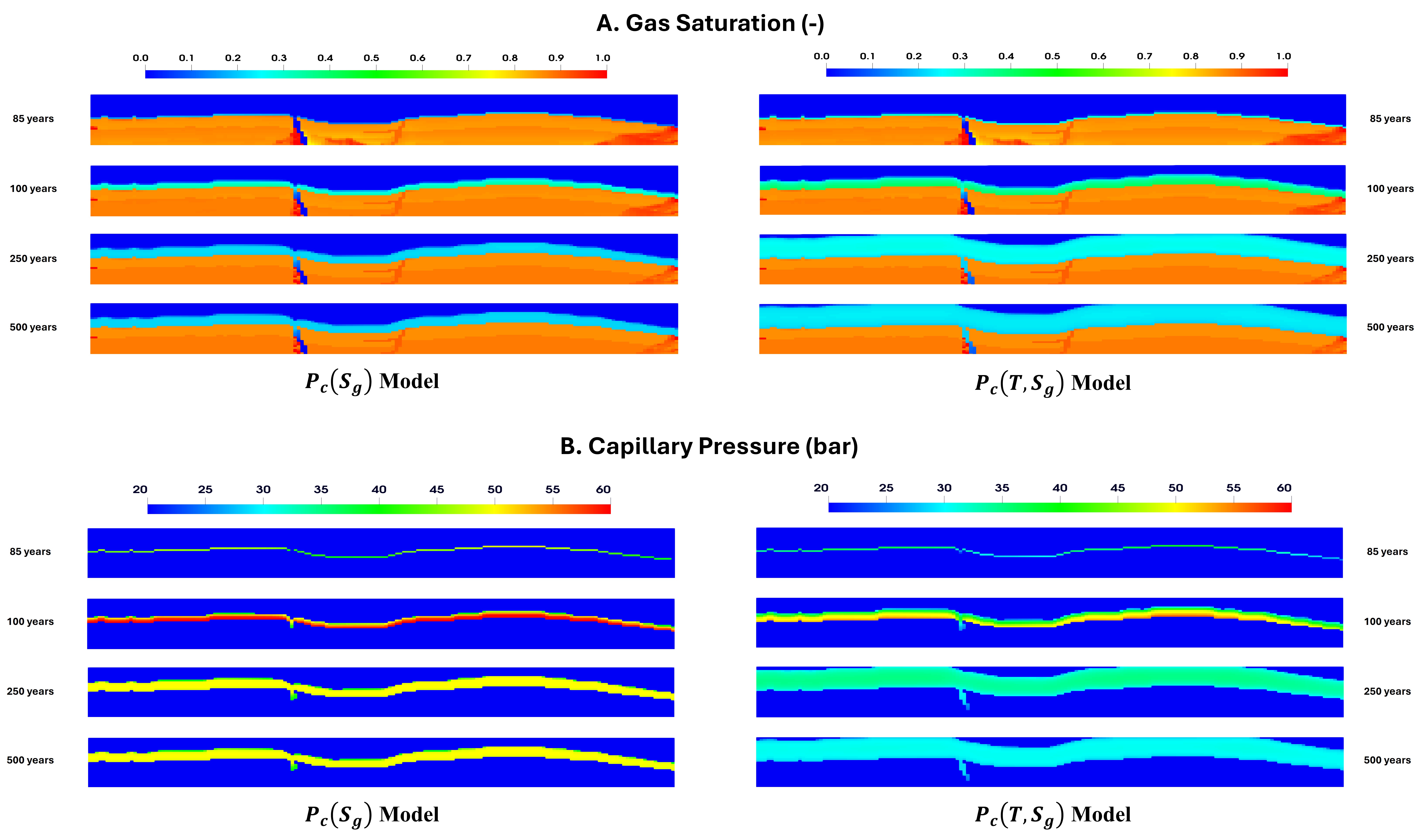 该模型被嵌入自主研发的CO2地质封存和利用数值模拟器(PRSI-GCUS)中,构建了热–流耦合的储层模拟框架。研究基于修改后的SPE11C三维CPG地质模型,包含具有真实非均质性与各向异性的地层与盖层结构。通过对80年的CPG运行过程和2000年的后期封存过程进行数值模拟,对比传统Pc(Sg)模型与考虑温度影响的Pc(T,Sg)模型的CO2运移路径差异(图2)。研究发现,在考虑温度效应后,气体进入盖层时所受到的毛管压力显著降低,使得CO2能够持续向上运移,最终突破盖层的封堵。