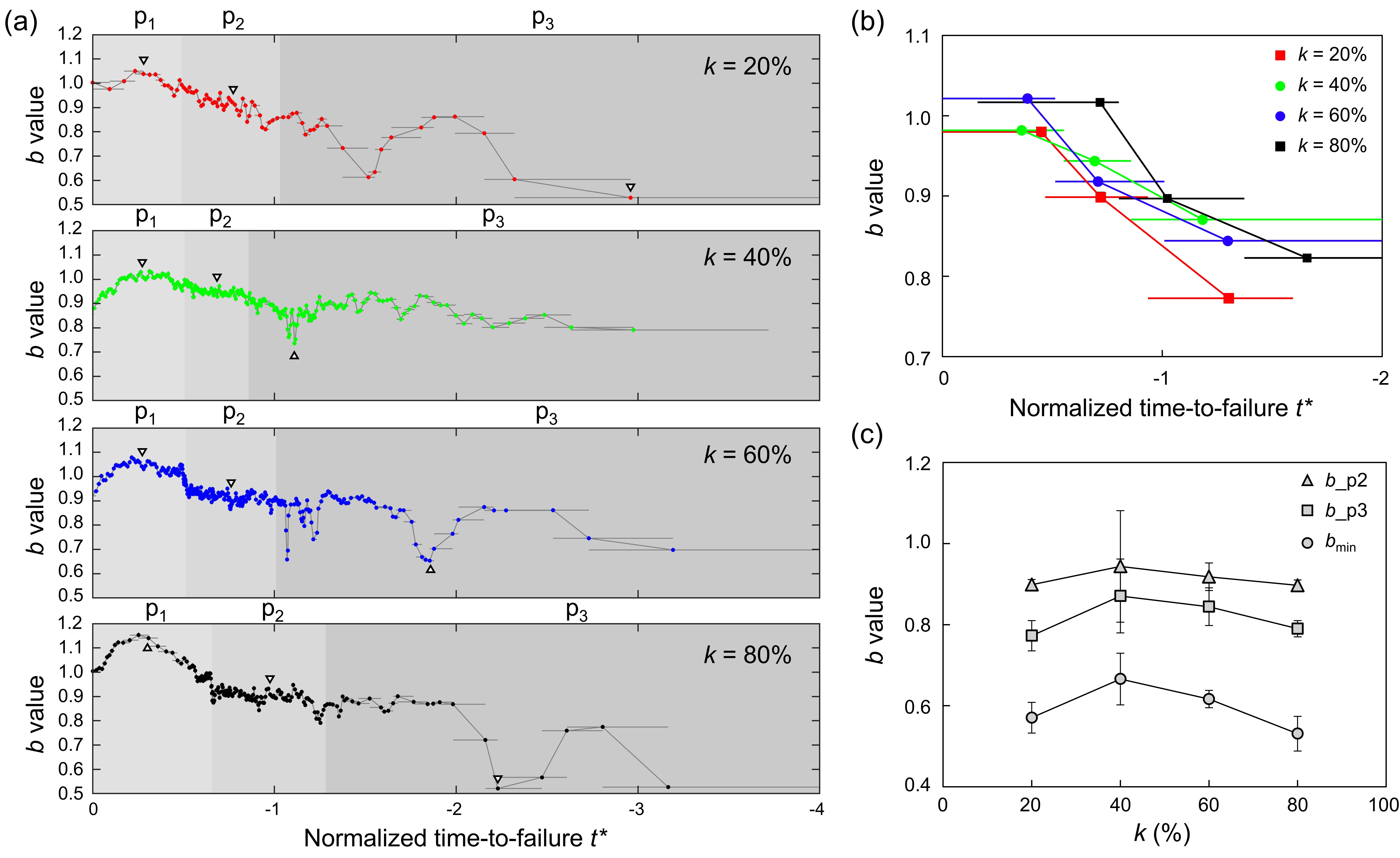 图4 声发射事件b值演化规律:(a)b值时移窗口估计;(b)根据各破坏阶段全体事件计算的b值;(c)特征b值比较