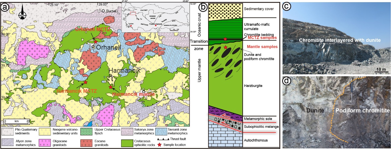 中国科学院地质与地球物理研究所苏本勋研究员以土耳其Bursa蛇绿岩中的似层状铬铁矿床(图1)为研究对象,开展了系统的野外地质调查、岩相学观察和矿物原位元素分析,并对比分析了全球典型蛇绿岩(如阿曼、土耳其Pozantı-Karsantı和Lycian蛇绿岩)中两类铬铁矿床的数据。研究团队通过对Bursa蛇绿岩壳幔过渡带中韵律式交替的铬铁矿条带与橄榄石条带进行精细剖面分析,结合Lycian蛇绿岩中含角闪石的铬铁矿-纯橄岩剖面研究,揭示了铬铁矿与橄榄石在接触边界处的成分突变规律,为流体-橄榄石相互作用提供了关键矿物学证据。