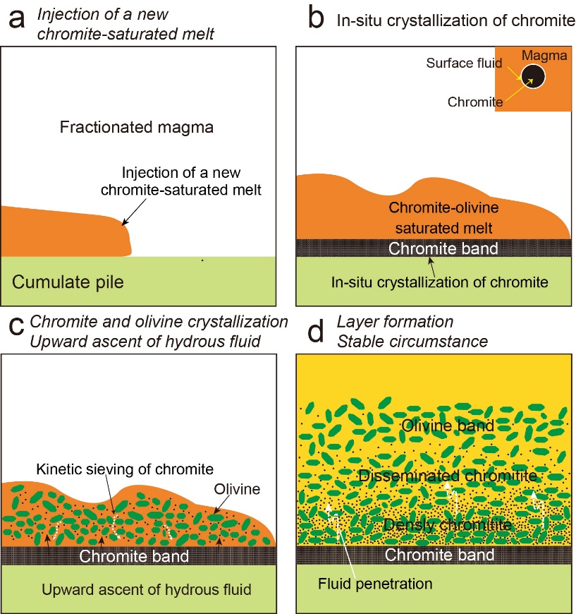 研究发现,蛇绿岩中似层状铬铁矿床虽在结构上与层状侵入体中的铬铁矿层相似,但规模更小、硅酸盐基质含量更高,且具有独特的韵律式条带结构(图2)。矿物化学分析表明,与豆荚状铬铁矿床相比,似层状铬铁矿床中的铬铁矿具有更高的Mn、Co、Sc、Ti含量和更低的V/Sc比值,指示其结晶自更高氧逸度的演化熔体/流体。剖面分析显示,铬铁矿-橄榄石接触带成分发生突变,而橄榄石带内成分呈渐变趋势;含角闪石剖面中角闪石结晶抑制了进一步改造,证实铬铁矿表面释放的含水流体是关键改造介质(图3)。基于上述特征,研究团队提出了两类铬铁矿床的成因联系模型:地幔序列中豆荚状铬铁矿床在岩浆通道内形成,铬铁矿表面吸附的含水流体渗透改造围岩橄榄石并结晶角闪石(图3);演化熔体/流体向上迁移至壳幔过渡带岩浆房,在压力降低及机械分选作用下结晶形成似层状铬铁矿床(图4)。流体不混溶与矿物-流体相互作用是连接两类矿床的核心过程。