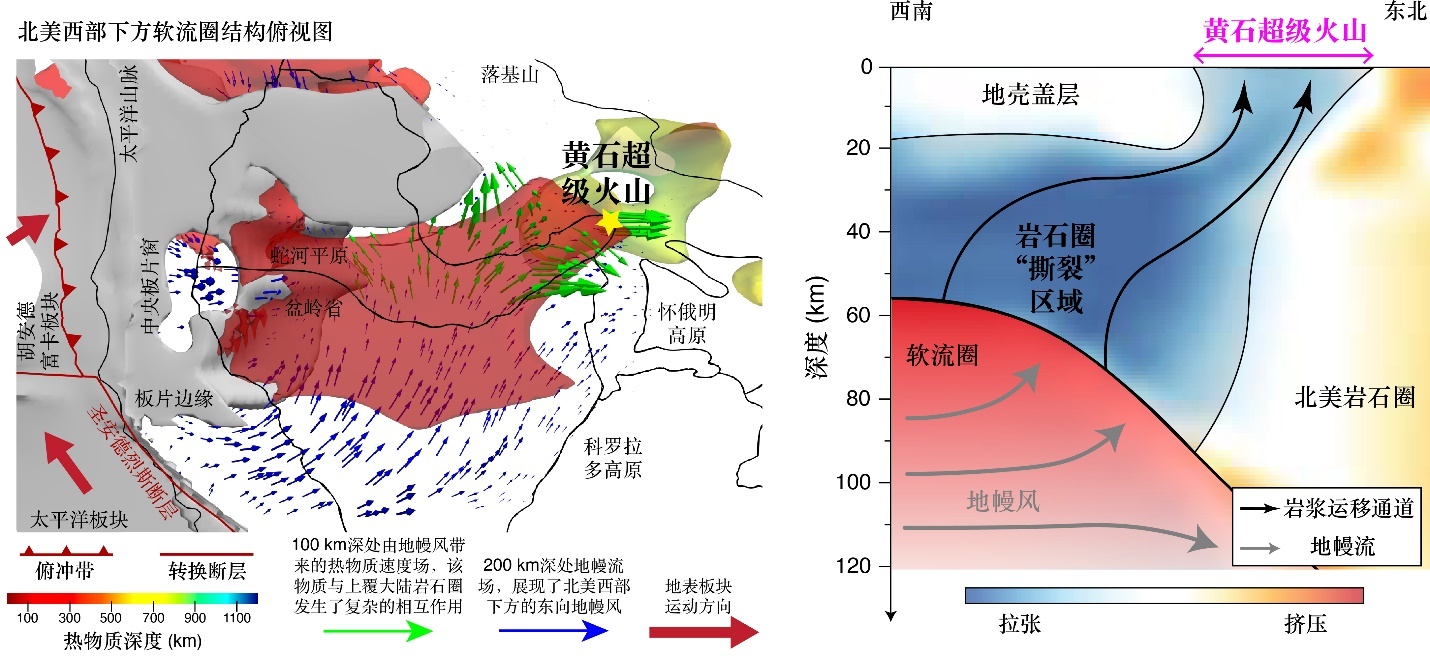 图2 黄石超级火山岩浆系统成因示意图。左侧:北美西部软流圈结构俯视图。红色的等值面展现了东向漂移的热物质。这些热物质在东向地幔风与上覆北美岩石圈拉扯导致的降压熔融过程中产生了大量幔源岩浆。黄色五角星标记了黄石超级火山在地表的位置。右侧:岩石圈应力和岩浆系统示意图。在地幔风-岩石圈相互作用产生的应力和岩石圈内部应力的共同作用下,黄石火山下方形成了一条向西南方向倾斜的快速拉张带(阴影区域),“撕裂”了北美大陆岩石圈。这一构造过程控制了黄石火山下方岩浆系统的形态,对黄石超级火山的形成和演化有重要意义。注:图中箭头仅指示速度的方向,不代表实际大小