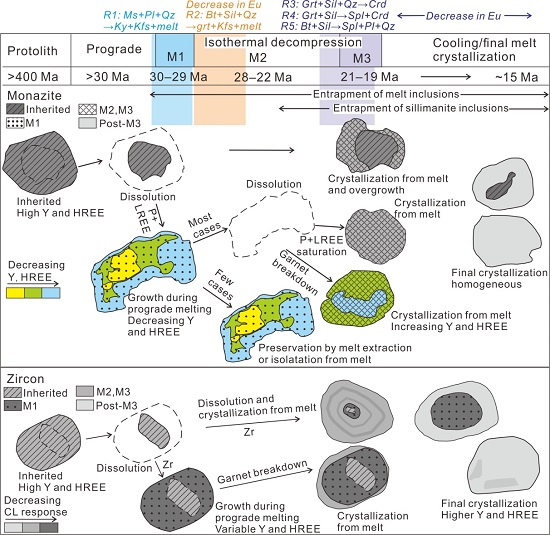 独居石是应用于造山带高级变质岩石定年的一种重要副矿物((Ce, La, Th)PO4),它在高温变质和深熔过程中往往具有复杂的化学成分和年龄环带。但是对其成因解释,尤其是建立变质反应和独居石变质年龄/成分的关系,一直是一项挑战。 基于此研究背景,中科院地质地球所岩石...