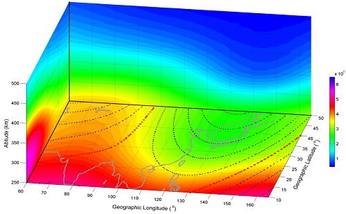电离层经度变化的起源一直以来都是国际高层大气物理研究的热点之一,而不同纬度带的经度变化特征及机制又完全不同。低纬电离层主要受E(电场)×B(磁场)电动力学过程的影响。中低纬的各种潮汐风场结构和电导率经度差异会导致电离层电场的经度差异,从而导致电子浓...