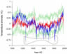图注:集成的千年代用温度(红色)与模拟温度(兰色)记录对比。单位是温度距平(公元1000-1985年全序列平均值为0值)。