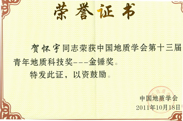 2011年11月1日,中国地质学会在京召开了第十三届青年地质科技奖颁奖大会。我所地球深部结构与过程研究室贺怀宇副研究员荣获“金锤奖”。本届评选共有10名同志获“金锤奖”、40名同志获“银锤奖”荣誉称号。