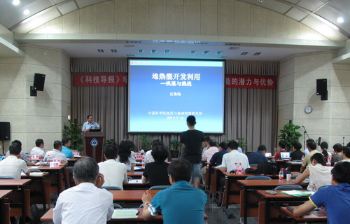 2012年7月10日,“地热能的潜力与优势”主题学术沙龙在我所成功举行。来自政府机关、科研院所、高等院校、《科技导报》社和地热企业的专家学者和研究生八十多人参加了活动。