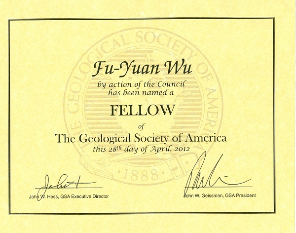 经美国地质学会会士的推荐和选举,2012年7月公开出版的GSA Today杂志公布了美国地质学会2012年新增选会士(GSA Fellow)名单。我所吴福元研究员因在花岗岩成因、大陆岩石圈演化和激光原位同位素分析等方面的成就而榜上有名。2012年度,来自全球各地的七十余位地球科学家荣获了该项荣誉。近日,吴福元研究员收到美国地质学会主席John W. Geissman先生发来的贺信和证书。