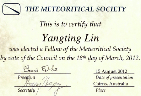 今年,在澳大利亚-凯恩斯召开的第75届国际陨石学会年会上,我所林杨挺研究员因在陨石学和比较行星学领域的研究工作,被授于国际陨石学学会会士(Fellow of the Meteoritical Society)。同时获此荣誉称号的还有其他9位来自欧美和日本等国的学者。