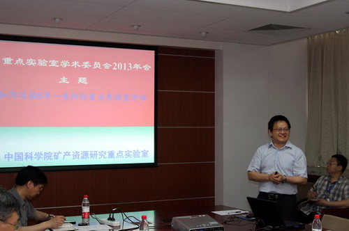 中国科学院矿产资源研究重点实验室2013年学术委员会会议于2014年5月23日在中国科学院地质与地球物理研究所召开。实验室学术会员会名誉主任叶大年院士、学术顾问翟裕生院士、学术委员会主任翟明国院士、学术委员会副主任王京彬研究员、刘建明研究员、学术委员会委员莫宣学院士、叶天竺教授级高工、华仁民教授、范蔚茗研究员、李献华研究员、徐明才研究员、殷长春教授、张连昌研究员,院前沿局地球科学处张鸿翔处长、我所杨进辉所长助理、郭敬辉所长助理、科研处刘强处长,重点实验室副主任高俊研究员、范宏瑞研究员,曾庆栋研究员、张宝林研究员、薛国强研究员及实验室研究人员、实验人员40余人参加了会议。