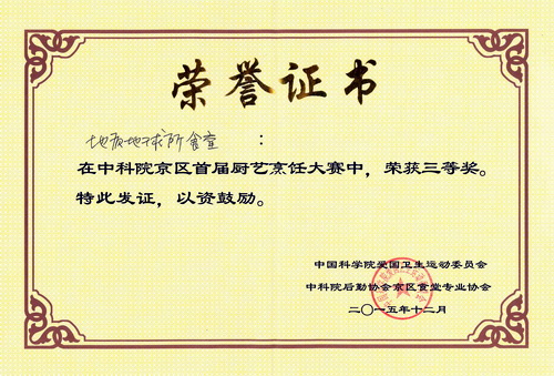 为加强京区各单位食堂工作交流,提高食堂员工工作技能,提升食堂伙食质量,保障职工学生饮食安全健康,2015年12月12日下午,院爱卫办和京区食堂协会在自动化所食堂举办了中科院京区首届厨艺烹饪大赛,大赛活动主旨是:倡导健康饮食理念、助力创新科技事业,共有19个京区单位代表队参赛,我所职工食堂代表队经过精心准备,努力拼搏,荣获中科院京区首届厨艺烹饪大赛三等奖。