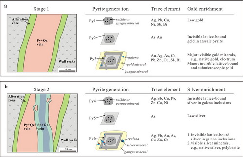金矿脉和银铅锌矿脉中黄铁矿世代及金、银富集过程图