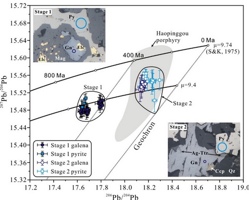 金矿脉和银铅锌矿脉黄铁矿和方铅矿Pb同位素组成对比图