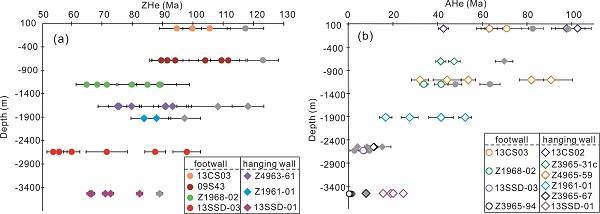 图2 三山岛金矿床所有锆石(a)、磷灰石(b)(U-Th)/He 年龄对采样深度投图