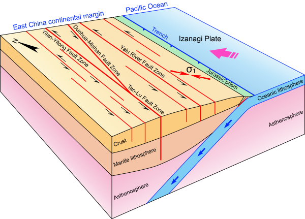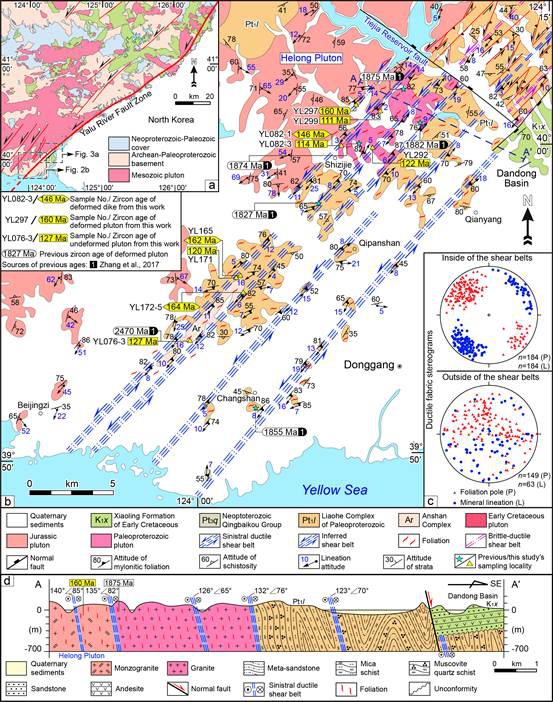 北东走向、长约700km的鸭绿江断裂带是中国东北地区的大型断裂带之一,属于郯庐断裂系的一个重要分支(图1)。目前人们对该断裂带在起源型式、时代和动力学背景方面的认识较为有限,长期缺乏可靠的证据。系统的野外调查和室内观察综合分析表明,该断裂带起源于左行平移运动。鸭绿江断裂带(丹东-集安段)自南西向北东依次出露有韧性、脆-韧性及脆性走滑构造。显微构造和石英C轴组构分析表明,韧性剪切带南西段的变形温度为400°C~500°C,北东段的变形温度为300°C~400°C。野外构造变形特征指示脆-韧性构造的变形温度为200°C ~300°C。利用脆性滑动矢量数据进行应力场反演,指示脆性左行平移断层形成于近N-S向的区域挤压应力背景之下。通过剪切带内变形与未变形侵入岩及上叠盆地内未变形火山岩的锆石U-Pb定年,限定左行平移活动时间为146-131 Ma,是区域性燕山运动B幕挤压事件的结果。综合本次与前人研究结果表明,中国东部大陆边缘在早白垩世初转变为剪切大陆边缘(图2)。该剪切大陆边缘以出现一系列北东走向的左行平移断裂为特征,是西太平洋区伊泽纳崎板块高速低角度斜向俯冲的结果。该构造过程发生于早白垩世区域性大规模金成矿之前,相关变形系统对随后的成矿及容矿构造具有重要的贡献。