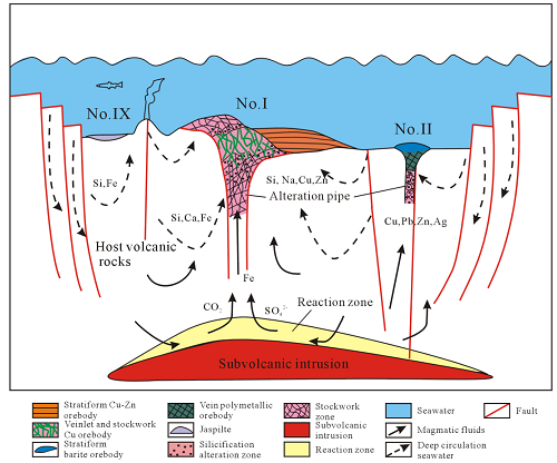 杨富全研究员及其合作者在国家深地资源项目(编号为2017YFC0601201)等的资助下,以阿舍勒铜锌矿为研究对象,在详细的野外地质调查的基础上,划分了成矿阶段,阐述了不同的蚀变类型,开展了重晶石、石英的流体包裹体和硫化物、重晶石和石英稳定同位素的研究工作,明确了成矿物质的来源、成矿流体的来源和演化,探讨了成矿元素的富集沉淀机制,并在此基础上建立了成矿模式图(图2)。