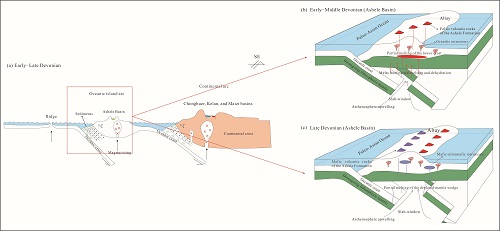 中国地质科学院矿产资源研究所杨成栋及其合作者在国家深地资源项目(编号为2017YFC0601201)等的资助下,以喀因德辉长岩为研究对象,在岩相学观察的基础上,除锆石U–Pb定年外,开展了全岩主微量和Sr–Nd同位素研究,明确了喀因德辉长岩的岩石成因,同时整合比较新疆阿尔泰其他地区晚泥盆纪基性-超基性岩体的岩石地球化学数据,在此基础上建立了新疆阿尔泰泥盆纪“双弧”构造模式(图1)。