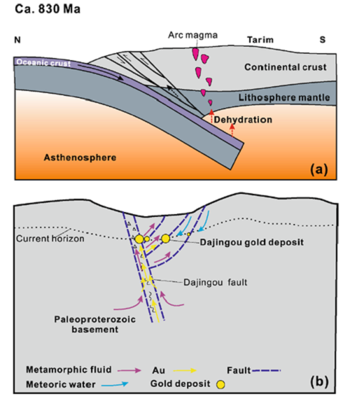 2)通过含矿石英脉热液锆石的U-Pb同位素和矿体热液绢云母的Ar-Ar同位素年代学将大金沟金矿的成矿时代限定为新元古代(ca. 0.83Ga)。