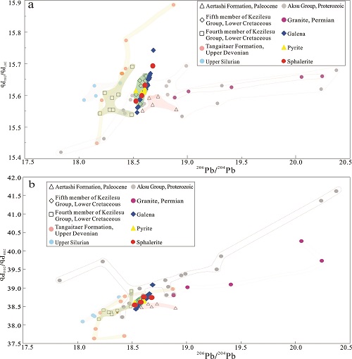 图1 新疆乌拉根铅锌矿床及外围矿石硫化物和可能的矿源层/岩Pb同位素组成