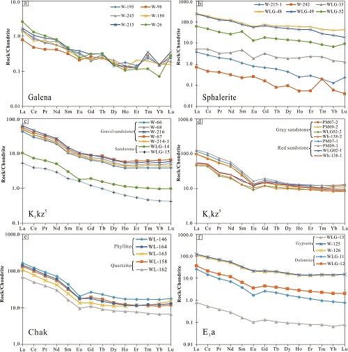 图2 新疆乌拉根铅锌矿床及外围矿石硫化物和可能的矿源层/岩稀土元素组成