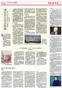 | 2019年7月5日《中国科学报》文化版用了 4/5 版的篇幅刊登了 "请历史记住这栋楼" 的专题报道。该报道阐述了我国1958年"科学城"遗址保留至今的唯一地标性建筑,现中国科学院地质与地球物理研究所"地6楼"的历史变迁。60多年来,从地质所到地质地球所,走过了极不平凡的发展道路,特别是从这座楼里先后走出了49位院士和大批科技精英,他们为共和国的国民经济建设、国防和科学事业的发展以及优秀人才的培养作出了不可磨灭的历史贡献。 |