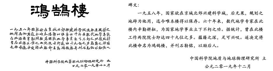 | 2020年1月3日,叶大年院士和所长吴福元院士共同为 "鸿鹄楼" 石碑揭幕。 自此,这栋地质地球所 "地6楼" 得以刊石勒铭,永载史册,激励大家传承和弘扬她所代表的爱国情怀和科研精神。十三届全国人大常委会副委员长、民盟中央主席、中国科学院副院长丁仲礼院士作为 "鸿鹄楼" 的命名人,书写了石碑上 "鸿鹄楼" 三个字并撰碑文。碑文文字为中国书法协会理事、四川省书法协会副主席洪厚甜书写。寥寥百余字的碑文道出一段历经一甲子风云的建筑之历史。 |