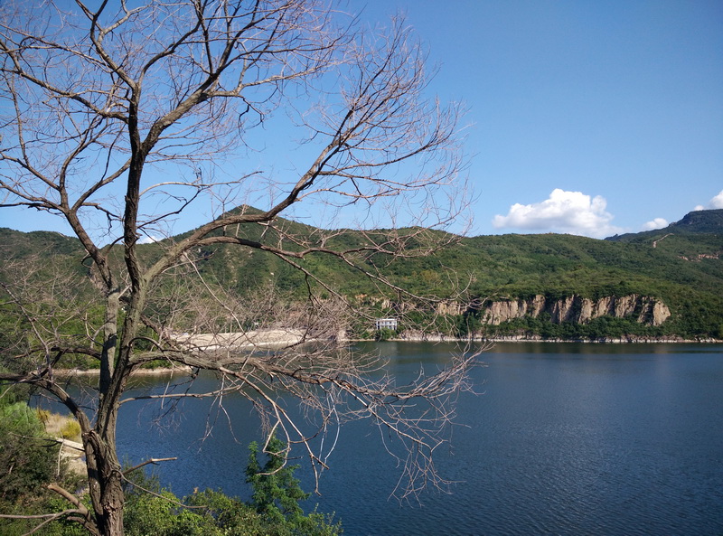张家口一处水库。周围群山与蓝色湖面相得益彰。山与湖接触位置由于湖面水位下降露出浅色岩石,宛如水面的一圈项链。