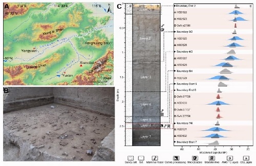 图1 下马碑遗址的位置、地层与年代。A, 下马碑遗址在泥河湾盆地中的位置;B,下马碑遗址主文化层(第六层)发掘面;C,遗址地层剖面及测年结果。(研究团队提供)