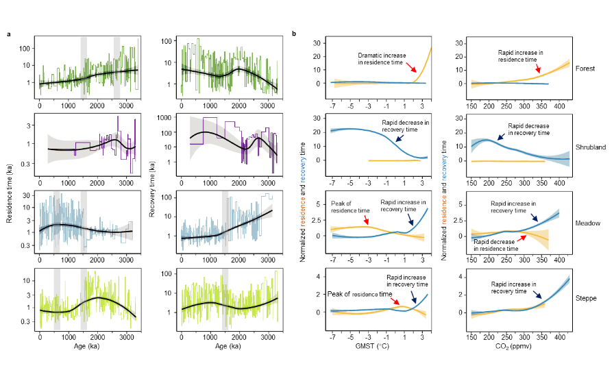 世界上最大的高寒草甸生态系统是如何起源的?如何响应不同时间尺度的气候变化?未来又将如何演化?它们既是前沿基础理论问题,亦是应对气候变化及生态环境建设面临的紧迫命题。中国科学院地理科学与资源研究所赵艳等的研究较系统地回答了上述问题。成果以“Three-and-a-half million years of Tibetan Plateau vegetation dynamics in response to climate change”为题,于2025年6月13日发表在Nature Ecology & Evolution上。 研究团队在高原东部海拔约3400m的若尔盖地区钻取了两根高质量连续湖泊岩芯记录(深度分别达1084m和573m),通过分析5000个孢粉样品,获得了350万年以来平均分辨率达约700年的植被变化序列(图1),并系统开展了生物群区、数理分析、统计建模和模式模拟研究。