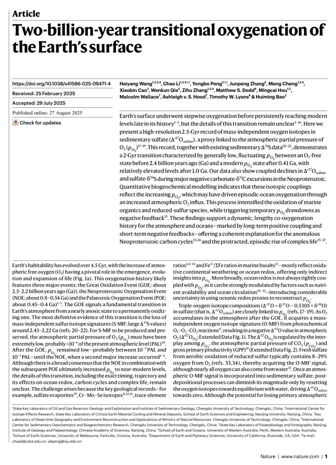 8月27日23时,成都理工大学李超教授团队在国际顶尖学术期刊Nature上发表题为 “Two-billion-year transitional oxygenation of the Earth’s surface”(“地球表面20亿年过渡性氧化”) 的最新研究成果,其中论文第一作者是成都理工大学王海洋研究员,通讯作者是成都理工大学李超教授和南京大学彭永波教授。