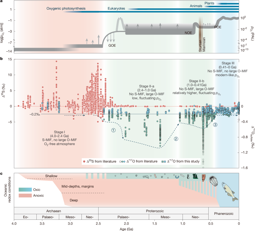 40亿年来沉积硫酸盐的Δ33S 和Δ′17O记录首次直接刻画了地球大气长达20亿年的三阶段氧化(图b),其揭示了地球大气(图a-b)和海洋氧化(图c)在数亿年时间尺度上的正相关关系和在百万年时间尺度上的负相关关系及其生命效应(图源 Wang et al. (2025) Nature) 据悉,李超教授团队于2023年在Nature上还发表了论文“Uncovering the Ediacaran phosphorus cycle”(“解密埃迪卡拉纪磷循环”)。李超团队主要致力于早期地球环境演化及其生命、矿产和能源效应领域的研究。