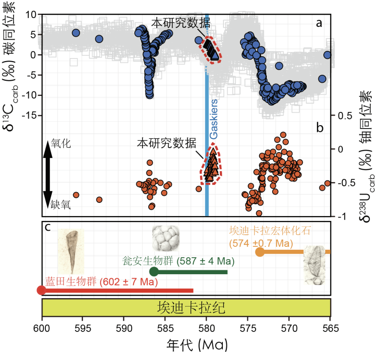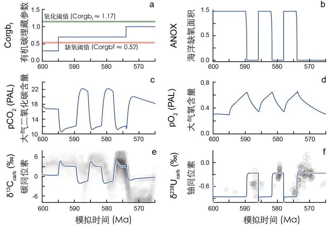 图2. 埃迪卡拉纪中期碳—铀同位素的地层变化及同时期化石记录汇总。 “数值模拟的成功之处在于,它不仅能解释我们观测到的同位素信号,更重要的是,它预测并重现了这种周期性波动的内在逻辑。”论文第一作者李子珩博士强调,“模型结果与地质记录的高度吻合,证实了‘氧气脉冲’并非随机事件,而是当时地球系统内在不稳定性的必然表现(图3)。”