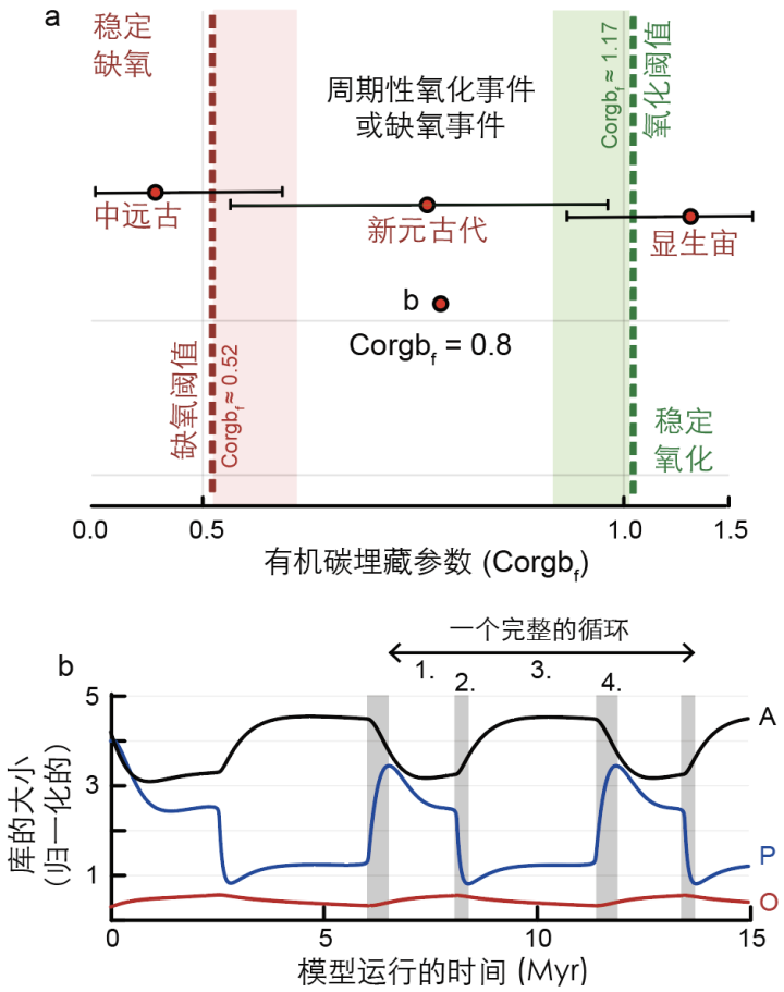 模型驱动理论创新,揭示地球系统“自持振荡”机制研究的核心突破在于成功构建并应用了“自持振荡”数值模型(图1)。团队创新性地模拟了埃迪卡拉纪中期的“磷-氧-碳”(P-O-C)生物地球化学循环,将5.79亿年前的“加斯基尔斯冰期”与其前后的全球性增氧事件直接动力学关联。模型结果表明,当时的地球系统处于一种不稳定状态,能够在缺氧与富氧两个稳态之间发生周期性振荡,周期约为500万年,且在约2000万年内至少规律性地发生了三次。