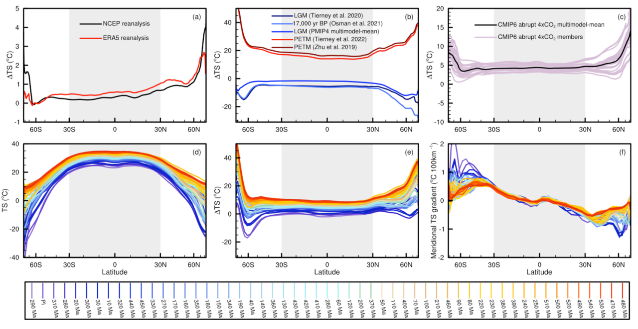 在全球气候变化研究中,“极地放大效应”广为人知:高纬度地区对温度变化尤为敏感,增暖或变冷幅度均显著大于低纬度。然而,热带地区的温度变化格局却长期未被系统认识。一项最新发表于《自然·通讯》(Nature Communications)、题为“Quasi-invariance of tropical meridional surface temperature gradient in a wide range of climates”的研究指出,在显生宙,无论地球处于冰期还是极端温暖期,热带地区(南北纬30°之间)的南北地表温度梯度变化甚微。这种“准不变性”现象,可能成为理解地球气候演变和预测未来变暖空间型态的一条基础性物理规律。 一、 极地的高度敏感与热带的显著稳定气候系统中的经向温度梯度,尤其是自赤道向极地的温差,深刻调控着哈德利环流、副热带急流、风暴路径等。研究一致表明,极地地区对全球变暖或变冷响应强烈,其背后涉及海冰-反照率反馈等多重过程的耦合。 与此形成鲜明对比的是,热带地区的纬向平均表面南北温度梯度(TMSTG)在不同气候背景下表现出惊人的稳定性。北京大学大气与海洋科学系杨军副教授团队,通过研究显生宙气候,发现无论是在全球平均温度低于现代约7℃的冰河期,还是在高于现代近30℃的极端温暖期,热带南北温差的变化幅度非常有限(图1)。