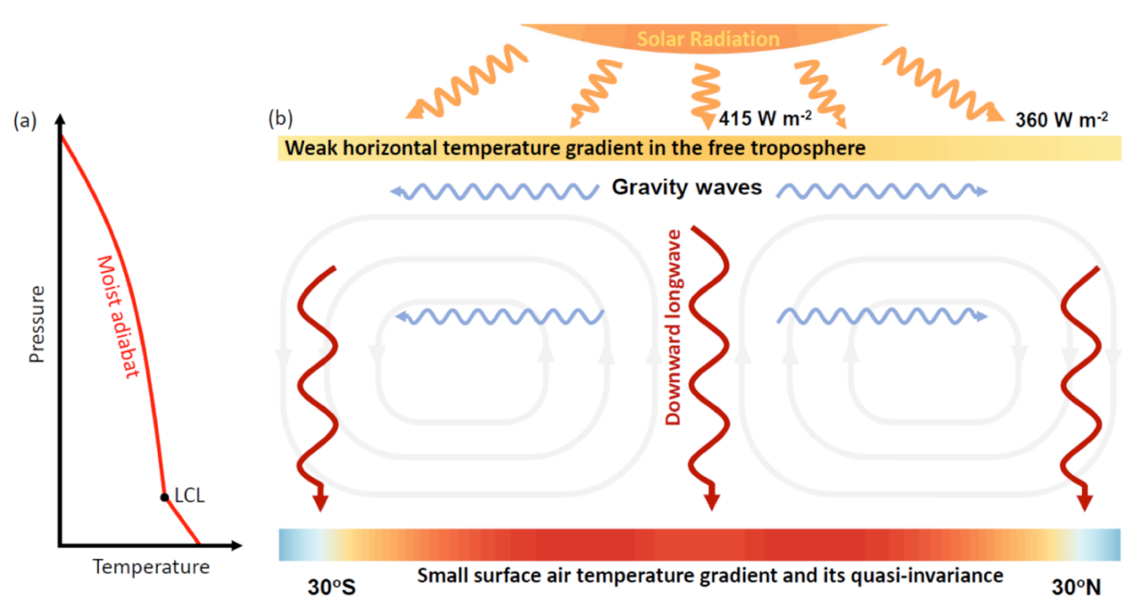 图2. 纬向平均地表温度及其变化。(a)再分析数据,2013-2022年与1979-188年之间的差别;(b)LGM、17000年前和PETM同化数据的地表温度相对于PI的变化;(c)CMIP6中4倍CO₂变化造成的温度变化;(d)5.4亿年来数值试验得到的地表温度;(e)地表温度相对于PI的变化;(f)不同时期的地表温度梯度。(e-f)中红色线条代表热的气候,蓝色是冷的气候。图中阴影区域是本文的研究重点。 三、 内在机理:辐射分布、弱温度梯度与湿绝热约束热带温度梯度何以如此稳定?研究揭示了三大核心机制(图3): 1.平缓的太阳辐射经向分布:历史上,地球自转轴倾角的变化很小,这使得低纬度入射太阳辐射随纬度的变化本身较为和缓。加之热带深对流区云层反射与大气水汽吸收的短波调节作用,最终到达地表的净短波辐射在热带区域内分布非常均匀。 2.弱温度梯度(WTG)的动力调节:在热带地区(约±20°纬度内),科里奥利力较弱,自由大气中难以维持显著的水平温度梯度。重力波与哈德利环流可快速调整水平方向的热力扰动,促进温度分布的均匀化。 3.对流湿绝热(CMA)的垂直控制:热带自由大气的温度垂直结构主要受深对流过程支配,使其接近湿绝热递减率。这种由快速对流(时间尺度约数小时)主导的热力结构与副热带大尺度下沉区(时间尺度约20天)相互耦合,通过类似“地转适应”的调整过程,确保整个热带地区的温度廓线不显著偏离湿绝热状态。 上述三类过程共同作用,使得外部强迫(如CO₂浓度变化、太阳辐射变化)引起的温度变化信号在热带自由大气与地表得以近乎均匀地传递与响应,从而维持了经向温差的稳定性。