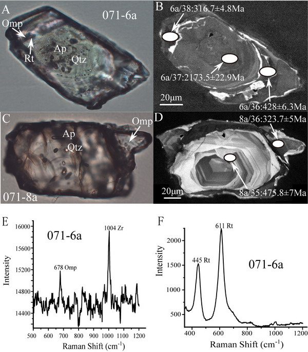 A, C-锆石边部的Omp和Rt包体;B, D-锆石阴极发光图像;E-绿辉石包体的激光拉曼光谱谱峰;F-金红石包体的激光拉曼光谱谱峰