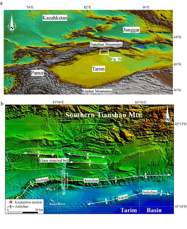 新生代岩石圈构造变动的环境效应是国际地学研究热点之一,而青藏高原及其周缘造山带无疑是开展上述研究的理想地区。东西向延伸约2500km的天山山脉是中亚规模巨大的造山带,晚新生代以来,受印度洋板块向欧亚板块深俯冲的远程效应影响,天山山脉发生了强烈的地壳缩短,并在前陆盆地堆积了源自天山山脉的巨厚沉积物,为我们从盆山耦合的角度探讨构造作用与新生代古气候变化之间的动力学联系提供了地质基础。