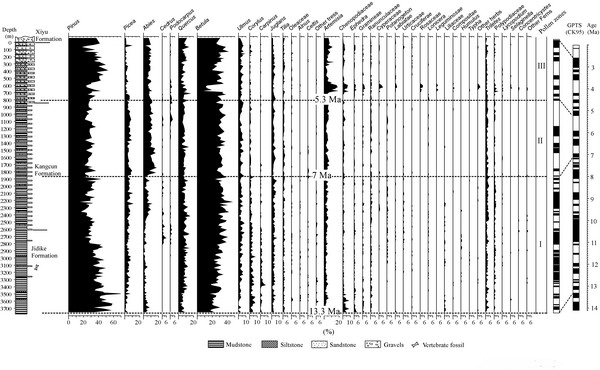 地质地球所新生代地质与环境研究室博士研究生张振卿与导师孙继敏研究员对塔里木盆地北缘库车前陆盆地开展了中中新世以来的高分辨率孢粉学分析,结果表明:库车前陆盆地在13.3-7百万年期间,构造运动相对稳定,孢粉结果表明气候温暖湿润;7百万年以来,受南天山向塔里木盆地俯冲的影响,发育同构造沉积、并发生地壳缩短,同时在孢粉记录上显示高海拔山地植被冷杉含量出现显著增加的趋势;5.3百万以来,以蒿属和藜科为代表的干旱、半干旱花粉含量突然增加,指示塔里木盆地在进入到上新世以后,气候更为干旱。他们认为塔里木盆地北缘在中新世末期的干旱化加剧与周围山地的抬升导致的“雨影”效应加强有关,同时,也可能是对北半球晚新生代以来气候变冷及副特提斯海阶段性西退的区域响应。
