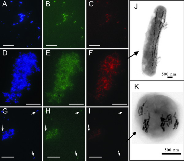 附图说明:北京密云水库中新发现的两类硝化螺旋菌门趋磁细菌的荧光原位杂交(A-I)与透射电子显微镜照片(J和K)