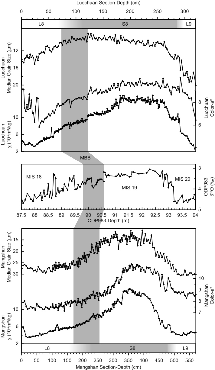 地质地球所地球深部结构与过程研究室博士后靳春胜与合作导师刘青松研究员对此开展了相关研究,利用前期工作的统计方法,对河南郑州附近的邙山剖面的L8+S8(第8层黄土和之下的古土壤)进行了五套平行样品的测试,尽可能精确地界定了MB倒转带的厚度。通过邙山和洛川剖面L8+S8的气候学参数对比,结合野外地层划分,充分表明这两个剖面的MB倒转带均位于L8和S8的过渡地带,具有很好的一致性。空间上(黄土高原东南缘和腹地)的对比表明MB倒转带并非单纯地位于L8或S8,而是一部分属于S8,一部分属于L8。这个结论较好地解释了MB界线所处地层位置不确定这一现象,即前人报道的MB界线有时位于L8中下部,有时位于S8顶部。他们认为一方面是采样分辨率的问题,导致没有准确、全面地识别出MB倒转带(前人采样间距>20 cm,本次研究中为2.5 cm),另一方面是L8、S8成土地层和气候地层的划分标准问题。本项研究界定了MB的精确地层位置,进一步表明应该将L8和S8分别对应于MIS18、19。