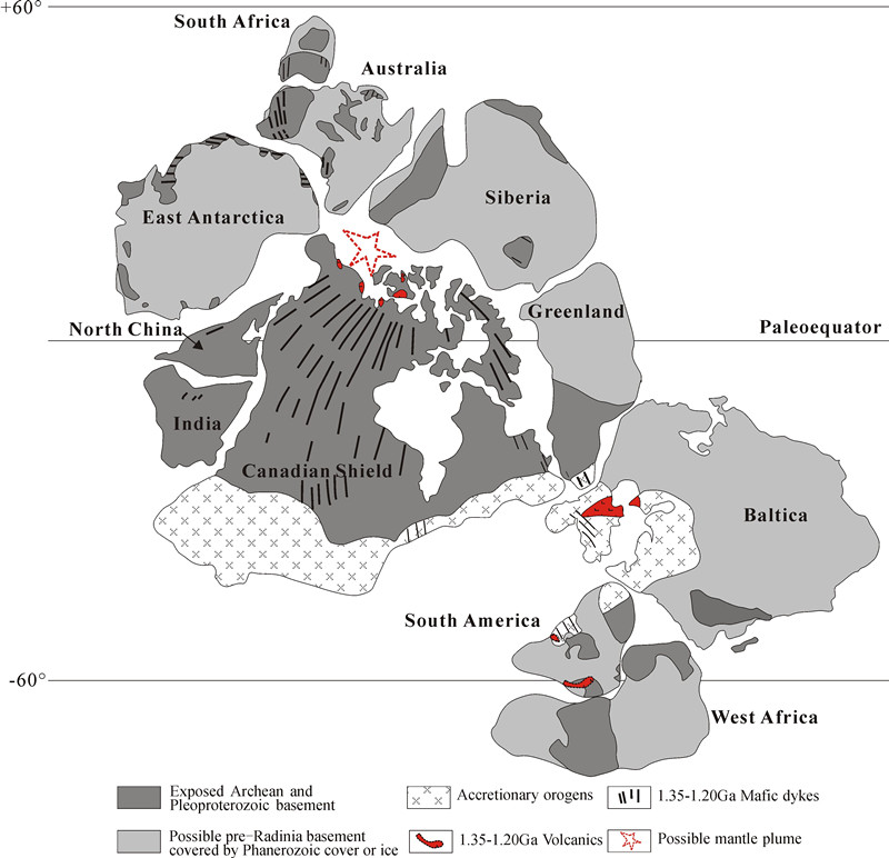 白云鄂博裂谷系的活动时代与Columbia超大陆裂解事件相吻合,裂谷系内部大量共生的火成碳酸岩与基性岩墙正是超大陆最终裂解的产物。结合近期的古地磁研究成果,华北克拉通在中元古代中期(1.35-1.21Ga)很有可能与印度古陆及加拿大地盾相邻,在同一个超级地幔柱的作用下,经历了强烈的裂解运动。