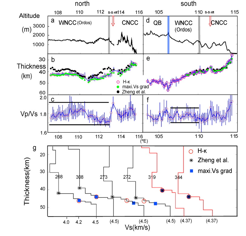 附图说明:地表地形(a,d),地壳厚度(b,e),Vp/Vs 比(k)和南、北测线下方地壳S波速度结构(g)比较。"H-k", "Zheng et al ", "maxi.Vs grad"对应的符号分别表示用接收函数H-k方法,接收函数波形反演方法以及S波速度变化最大时对应的地壳厚度和波速比。图(g)列出了南(红色)、北(黑色)测线下方典型台站下方的地壳S波速度结构和不同方法得到的地壳厚度。(注:图中的地壳S波速度结构由郑天愉研究员提供)