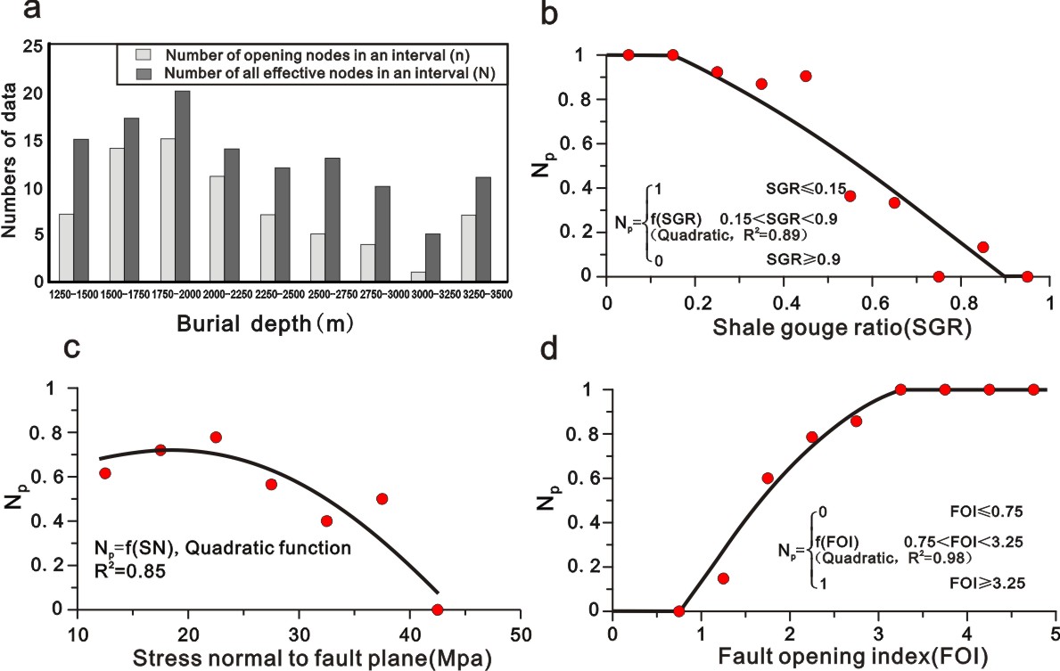 图1:(a)不同埋深区间内断层开启数据点数量n与所有数据点数量N的统计结果,利用这些数据计算各区间的断层连通概率(Np=n/N);断层连通概率(Np)与泥岩涂抹因子(SGR)(b)、断层面正应力(SN)(c)和断层开启指数(FOI)(d)的统计关系表明,综合参数能够有效表征油气运移过程中的断层启闭性。