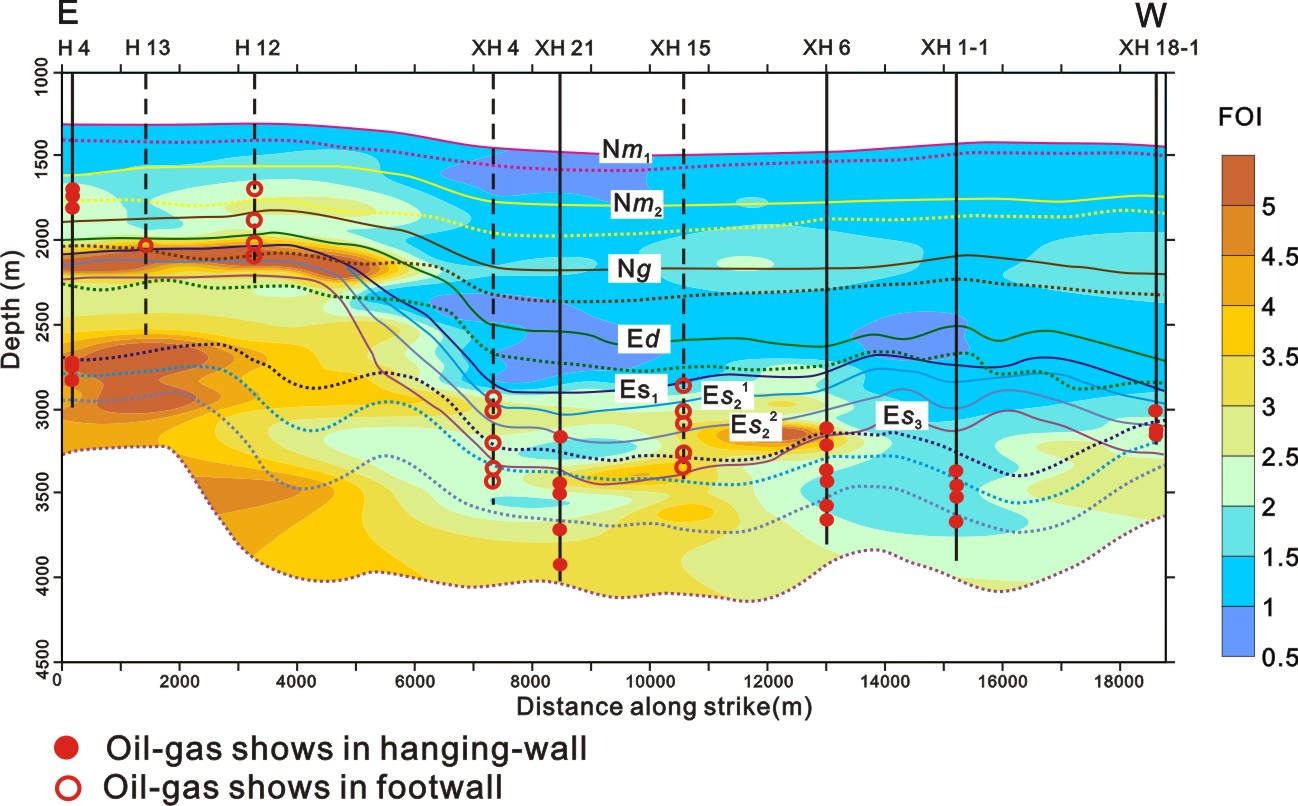 图2:断层开启系数在断面垂直方向上的拓扑分布与断层两盘储层内的油气显示;垂直线是钻井投影,实线表示钻井位于断面的前部,虚线表示钻井位于断面的后部;红色实心圆代表断层上盘地层内的油气显示,空心圆代表断层下盘地层内的油气显示;水平线是地层单元在断面上的投影,实线表示上盘地层,虚线表示上盘地层。