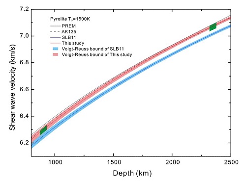地质地球所地球深部结构与过程研究室张志刚副研究员和英国伦敦大学学院的Lars Stixrude教授和John Brodholt教授合作,运用基于密度泛函理论的第一性原理模拟方法,针对下地幔矿物的热力学和弹性性质进行了大规模计算,并建立了能同时预测矿物相组成和物性的热力学模型。该研究表明:即使是下地幔最为主要的镁钙钛矿,尽管前人已做过许多实验和理论模拟工作,其弹性数据依然存在很大的不确定度。一方面在同时高温和高压条件下通过实验就位测量波速仍然是世界级的难题,另一方面理论模拟方法本身的误差还没有系统讨论过,而这些误差要远远大于下地幔地震观测模型的误差,从而为准确解释地震数据、推测下地幔成分带来困难。该研究提出一种修正密度泛函理论系统偏差的方法,内在综合考虑压力、高温非谐性效应的影响,从而提高了模拟结果的精度和准确性;该研究发现镁钙钛矿剪切波随温度下降的速度要低于前人估计,因而上地幔矿物学模型(pyrolite)可以很好地与一维地震学模型吻合(图1)。该研究对回答下地幔相关科学问题提供了重要约束。