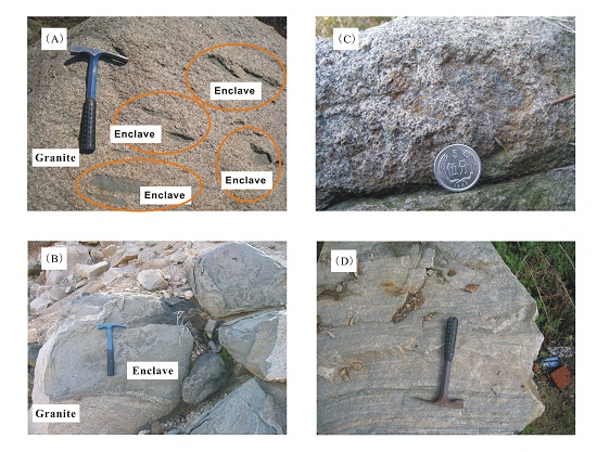 图2 (A)光头山250Ma花岗岩及其暗色包体;(B)光头山207Ma花岗岩及其暗色包体;(C)大营子闪长岩;(D)吉旺营子花岗质片麻岩