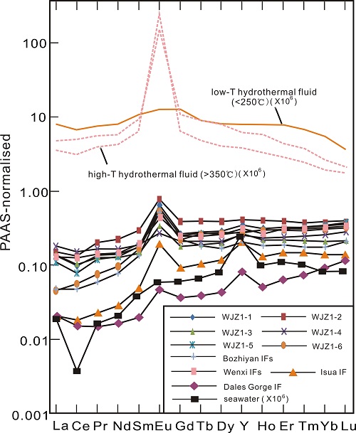 针对于此,地质地球所固体矿产资源研究室博士生王长乐和导师张连昌研究员等人选取五台绿岩带王家庄BIF作为研究对象,从地质和地球化学、矿物学和同位素年代学等方面对BIF和相关的表壳岩进行了系统研究,并首次在国内尝试了BIF Sm-Nd同位素的研究,主要获得如下认识:(1) BIF的火山岩夹层SIMS锆石年代学间接约束其形成时代为2543 Ma;(2) BIF原始沉积的产物可能为水铁矿、无定形硅、细粒的碳酸盐软泥和含铁的硅酸盐;(3) BIF的负Ce异常显示晚太古宙局限盆地古海水已开始发生氧化 (图1);(4) 同期火山岩地球化学及Sm-Nd同位素特征指示BIF形成于弧后盆地;(5) BIF具多种物质来源,包括海水、海底高温热液和古陆壳物质的再循环(图2和图3)。