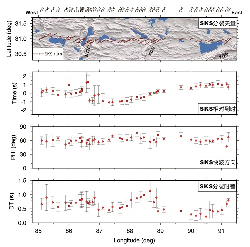 地质地球所特提斯研究中心陈赟副研究员及合作者基于TIBET-31N台站资料,在有针对性地提高横向分辨和减小测量误差的前提下,开展了震相-方位-震中距优选、多种方法联合等分析处理工作,获得了沿剖面SKS到时和横波分裂参数的细节变化特征。研究结果表明,SKS到时和横波分裂参数的东西向变化呈现出与地表南-北向裂谷分布高度相关的分段性:自东向西,东段(申扎-定结裂谷以东),SKS到时最晚,横波分裂时差最小(约0.2s);中段(申扎-定结裂谷以西,尼玛-定日裂谷以东地区),SKS到时最早,横波分裂时差中等(约0.5s);西段(尼玛-定日裂谷以西),SKS到时较晚,分裂时差最大(约0.7s)。