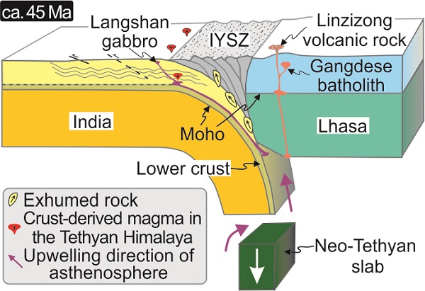 缝合带南侧(被动陆缘一侧)特提斯喜马拉雅地区碰撞后最早的岩浆活动为46~42Ma,与板片断离引起的热扰动有关;缝合带北侧(活动陆缘一侧)弧岩浆作用在45~40Ma停止,则与板片断离后印度大陆岩石圈向北运动屏蔽了深部来源的热有关。