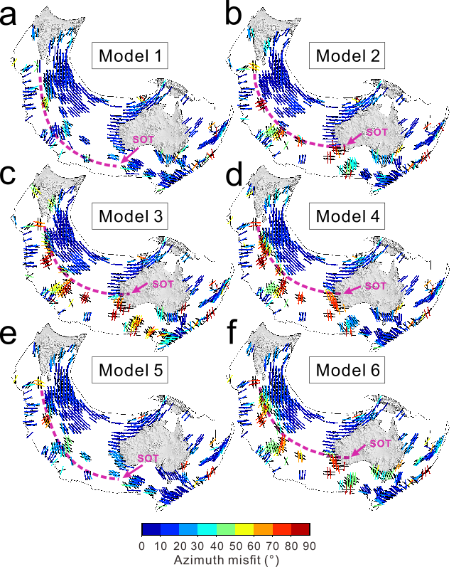 研究团队考虑了全球板块运动速度和应力应变等多种观测对驱动力的约束作用(Zheng et al., 2025)。他们首先对当前全球板块运动速度进行了拟合(图3)。研究结果显示,多组驱动力组合均能再现现今印度-澳大利亚板块的运动速度,表明在单一观测约束下驱动机制存在多解性。进一步将应力和应变观测数据作为多重约束条件,可以精确确定其主要驱动力来源(图4a)。研究发现,印度-澳大利亚板块内部的应力方向转换面(SOT, stress-orientation-transition interface)的位置对板块边界驱动力的相对强度极为敏感(图4)。在同时拟合板块运动和应力方向转换面位置时,苏门答腊-爪哇俯冲带的板片拉力被确定为现今印度-欧亚板块汇聚的最主要驱动力,而印藏碰撞则对印度板块的北向运动起到阻碍作用(图3a)。对于地幔剪切力,虽然其在不同区域的影响各异,但在印度板块下方是作为驱动力存在(图5),这也与前人的结论一致(Li et al., 2024)。