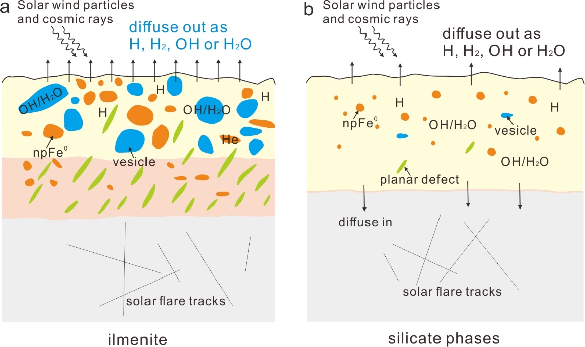 联合团队进一步提出,钛铁矿和硅酸盐矿物在水含量和H同位素组成上的差异很可能与其晶体结构有关。钛铁矿中的Fe-O和Ti-O键能低于硅酸盐矿物中的Si-O键,使其更容易与太阳风注入的H发生反应形成OH/H2O,同时促进纳米金属铁的形成。月壤颗粒风化层中广泛发育的囊泡结构是太阳风辐照作用的另一重要微观结构特征。太阳风注入的H和He会在囊泡中富集,当囊泡内部气压超过某一临界阈值时,反而会加速捕获H的逃逸。此外,月表频繁的温度变化、微陨石撞击以及太阳风溅射等过程,也会进一步促进钛铁矿中生成的水的丢失,导致其难以稳定保存(图3)。